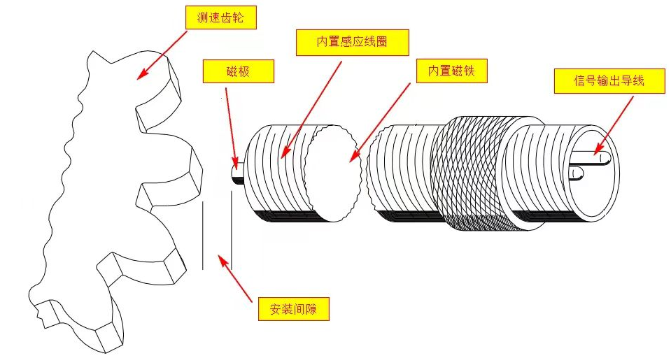 安装时探头正对齿轮端面。当齿顶与齿槽交替经过时,间隙的周期性变化使线圈阻抗同步波动,内部电路将其转换为对应的电压脉冲信号,通过检测脉冲频率即可准确计算转速。